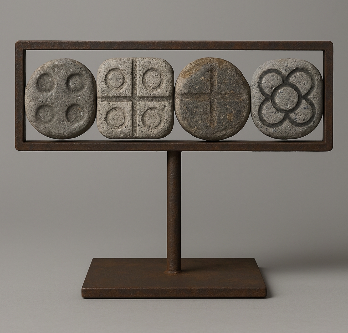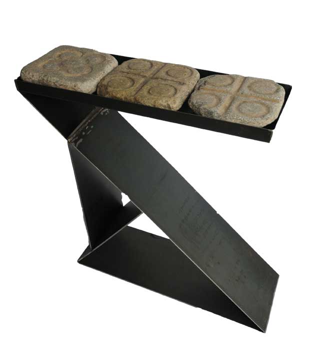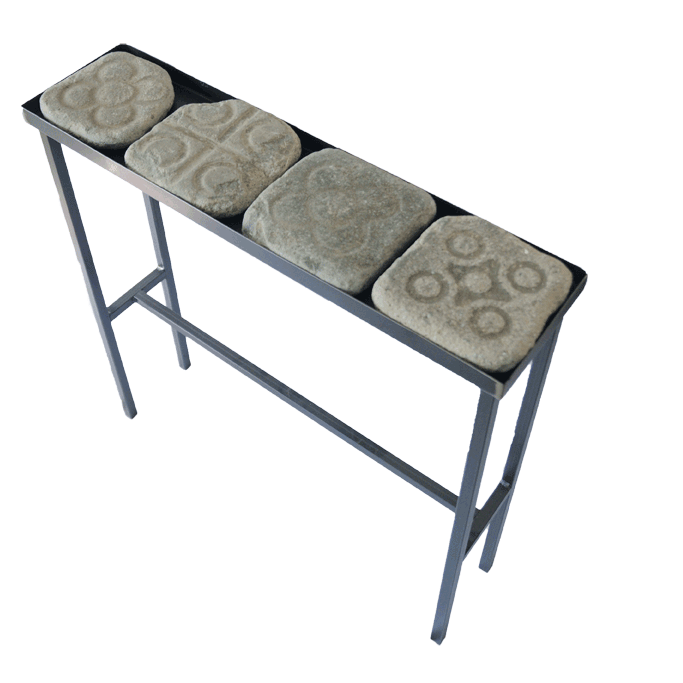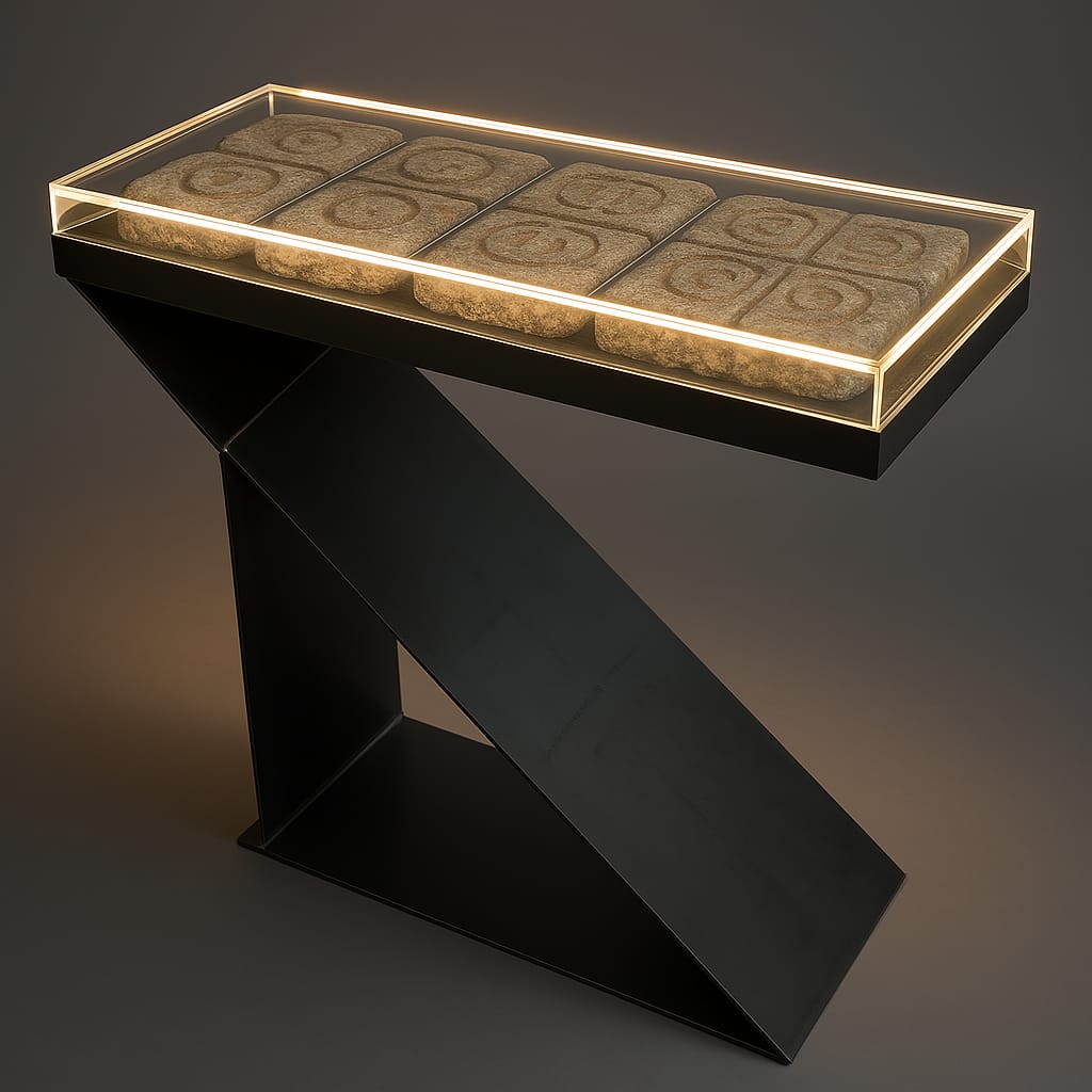 Handcrafted console table made of varnished iron, designed to hold four Panots. Finished with a transparent glass top that showcases the tiles. You can choose the models, and we will prepare the piece for you.