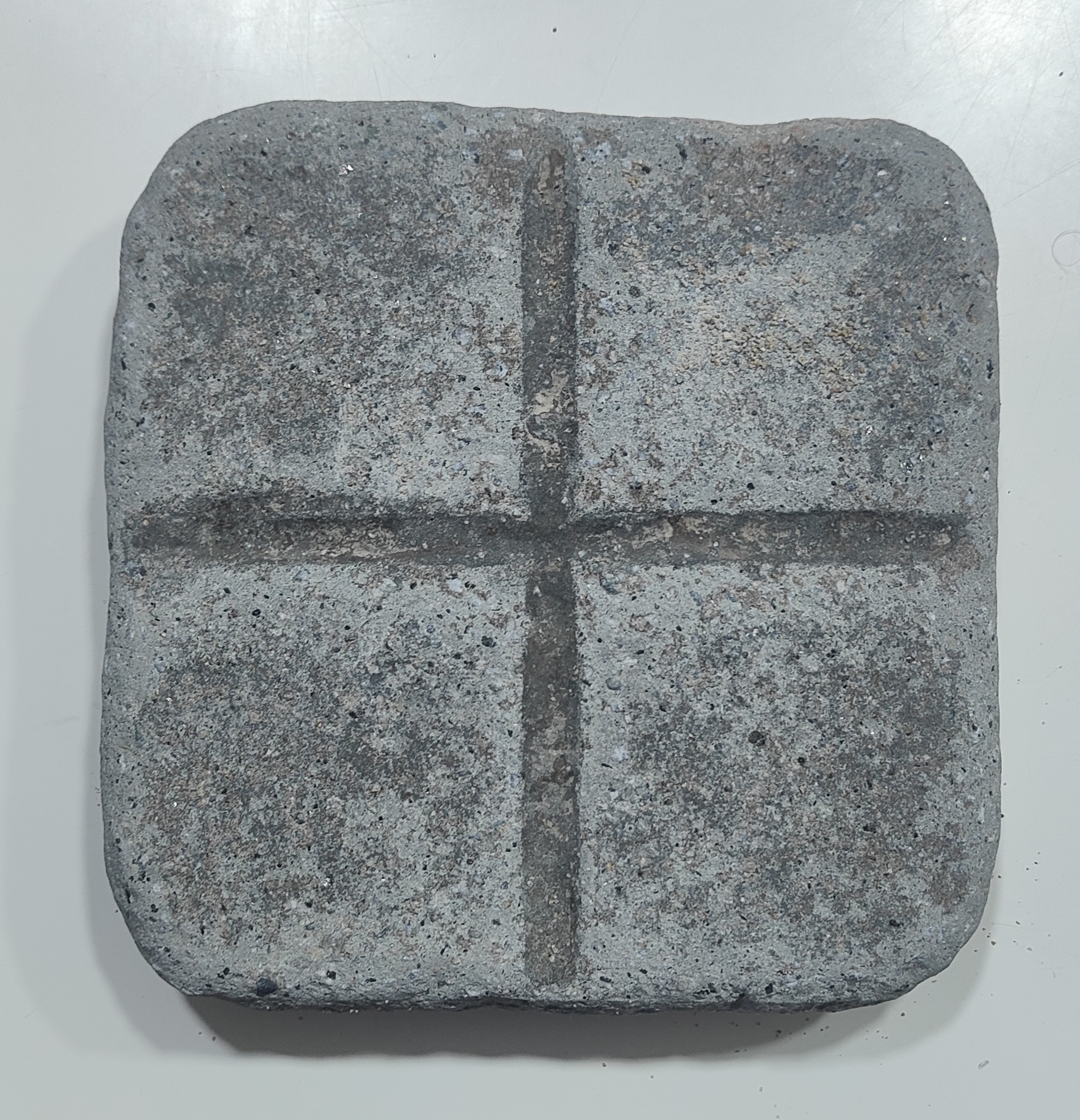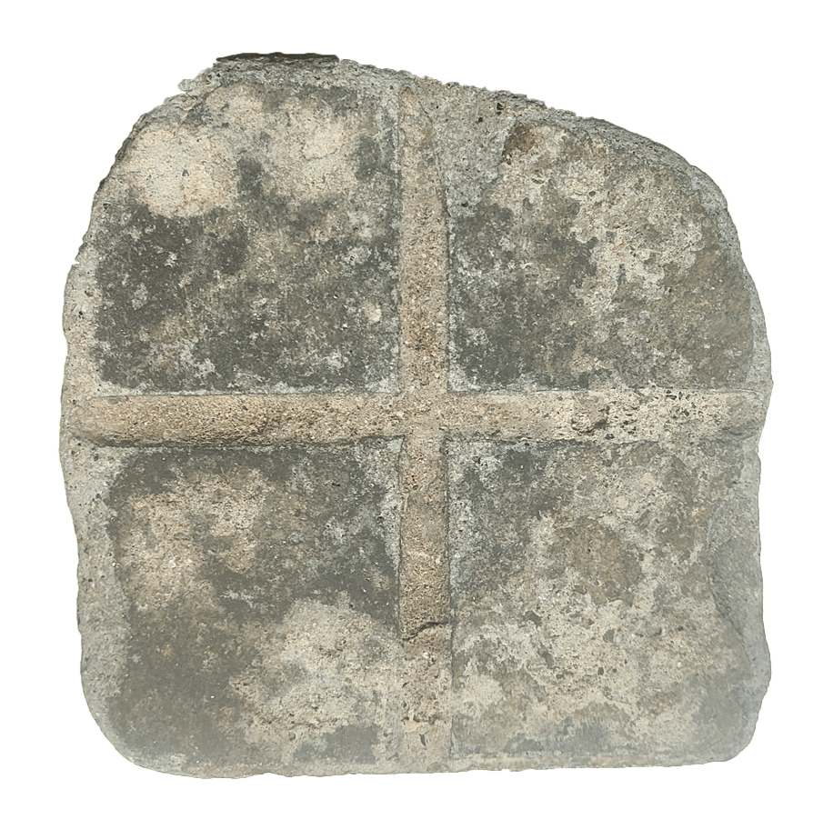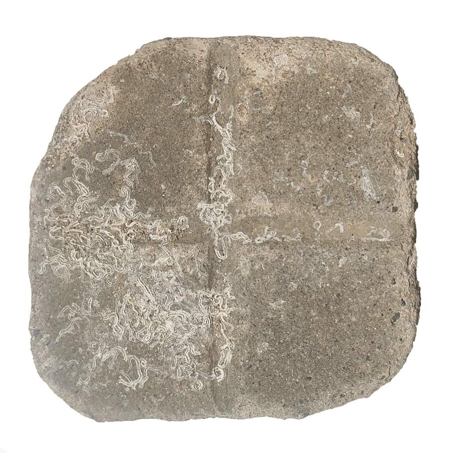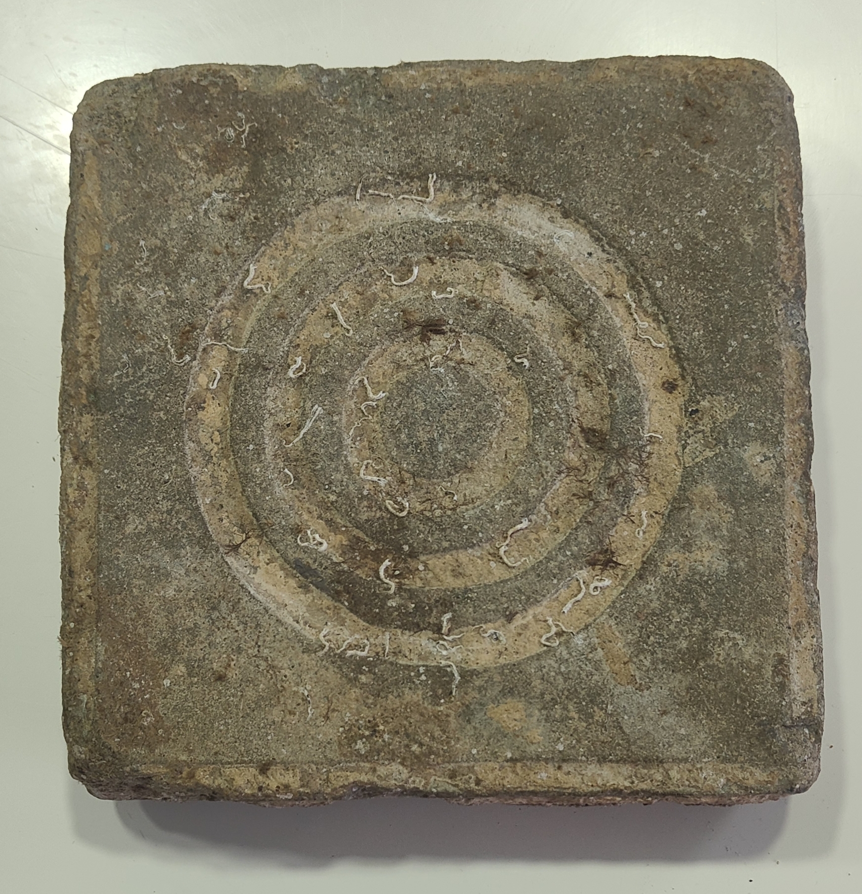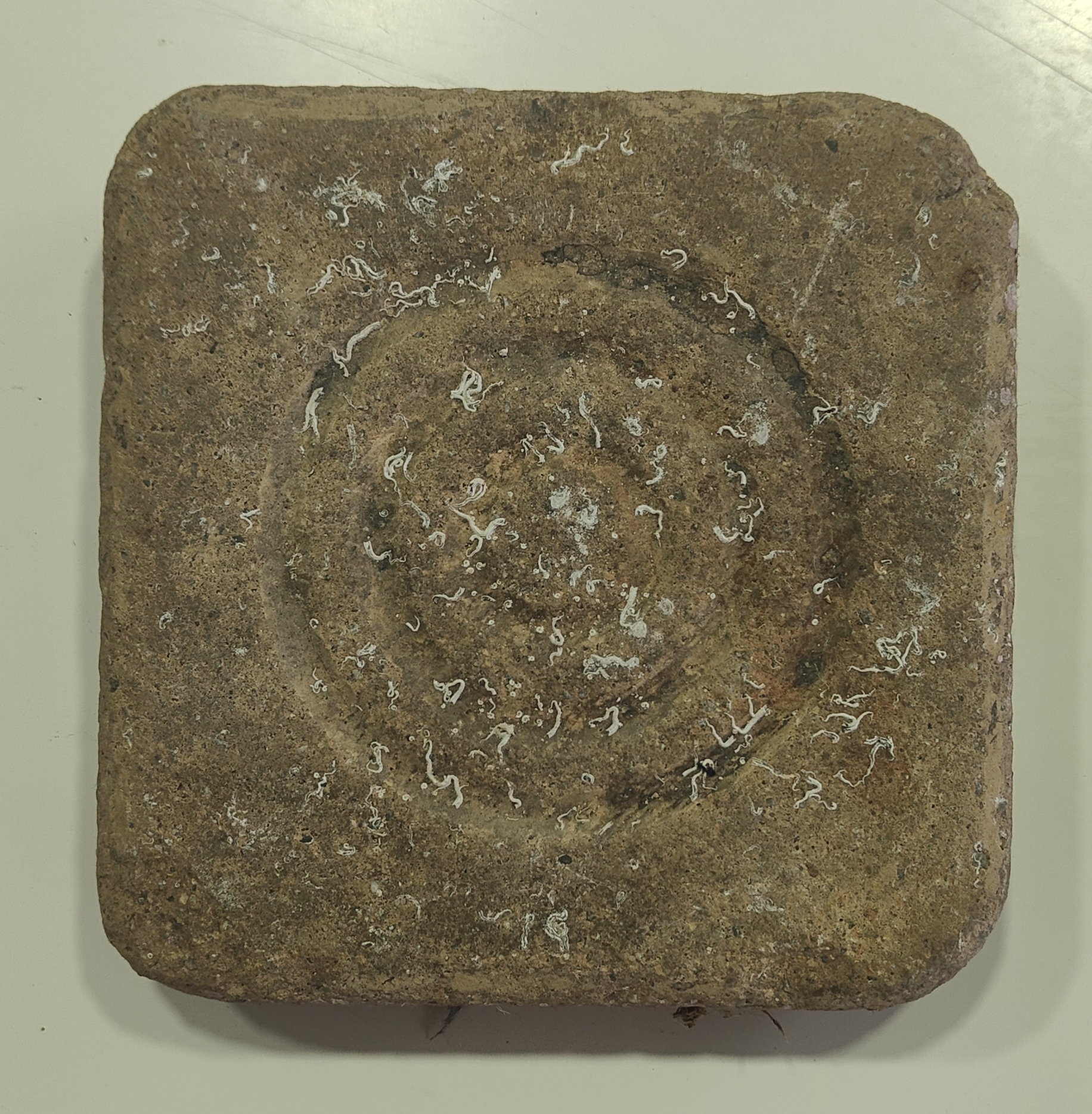 Historic Barcelona Panot, carefully reclaimed from the waters off the city’s coast, displaying the classic Tauleta design with inner circles. Corners show moderate general wear. Almost complete loss of the circle design, with the Tauleta still preserved.
