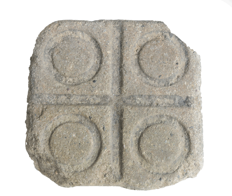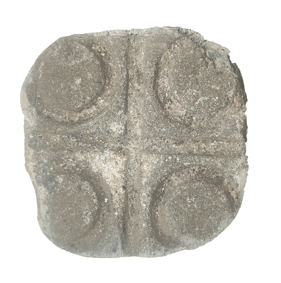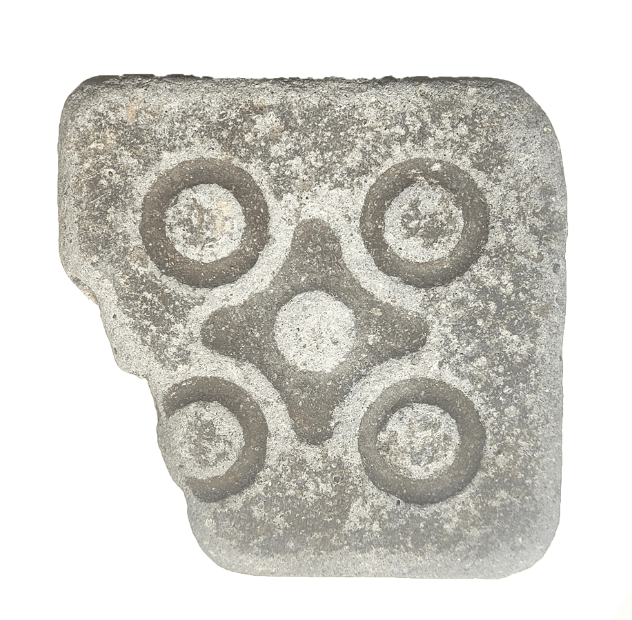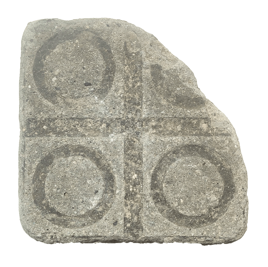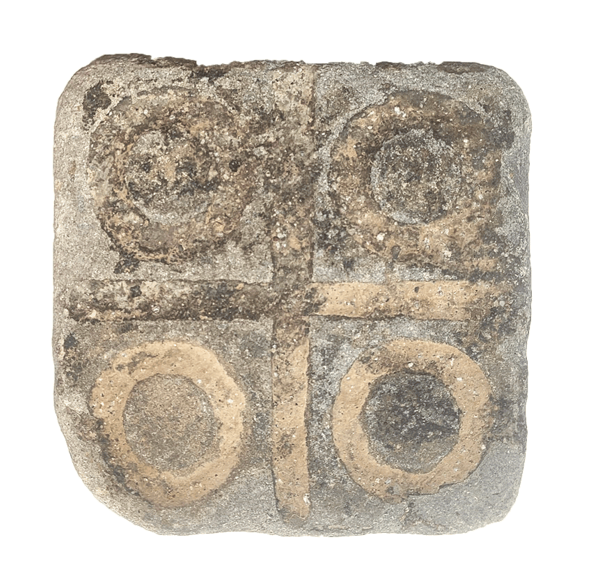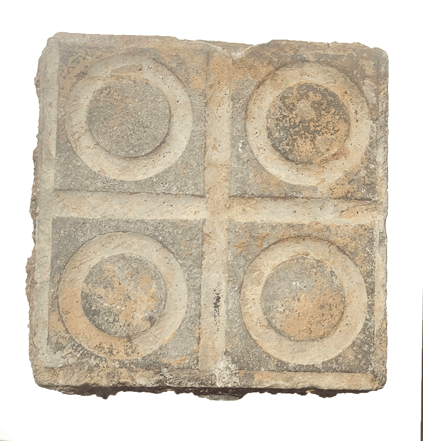 Recovered Panot from Barcelona’s shores, showcasing the distinctive Tauleta pattern with inner circles. The corners bear the marks of time with general wear. Small wear on the lower left part affecting the design