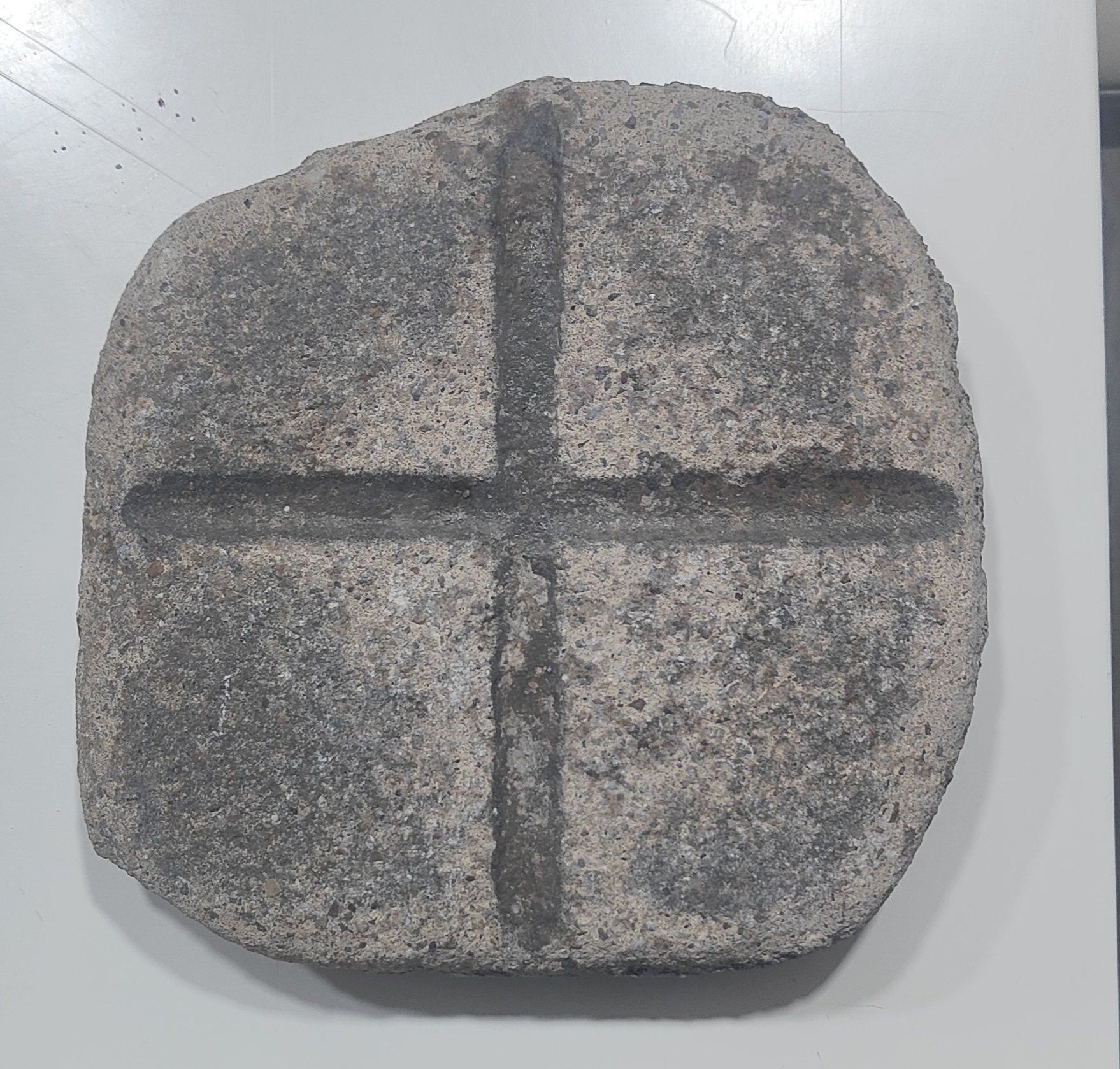 Original Barcelona Panot, retrieved from deep waters, with the traditional Tauleta engraving. Widespread wear marks and significant chipping on the upper left and lower right sections.