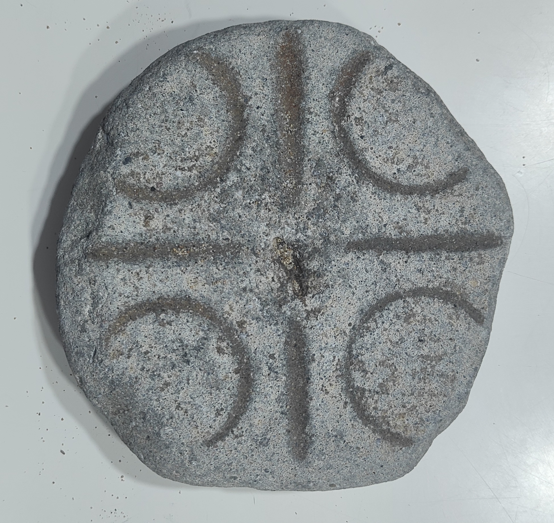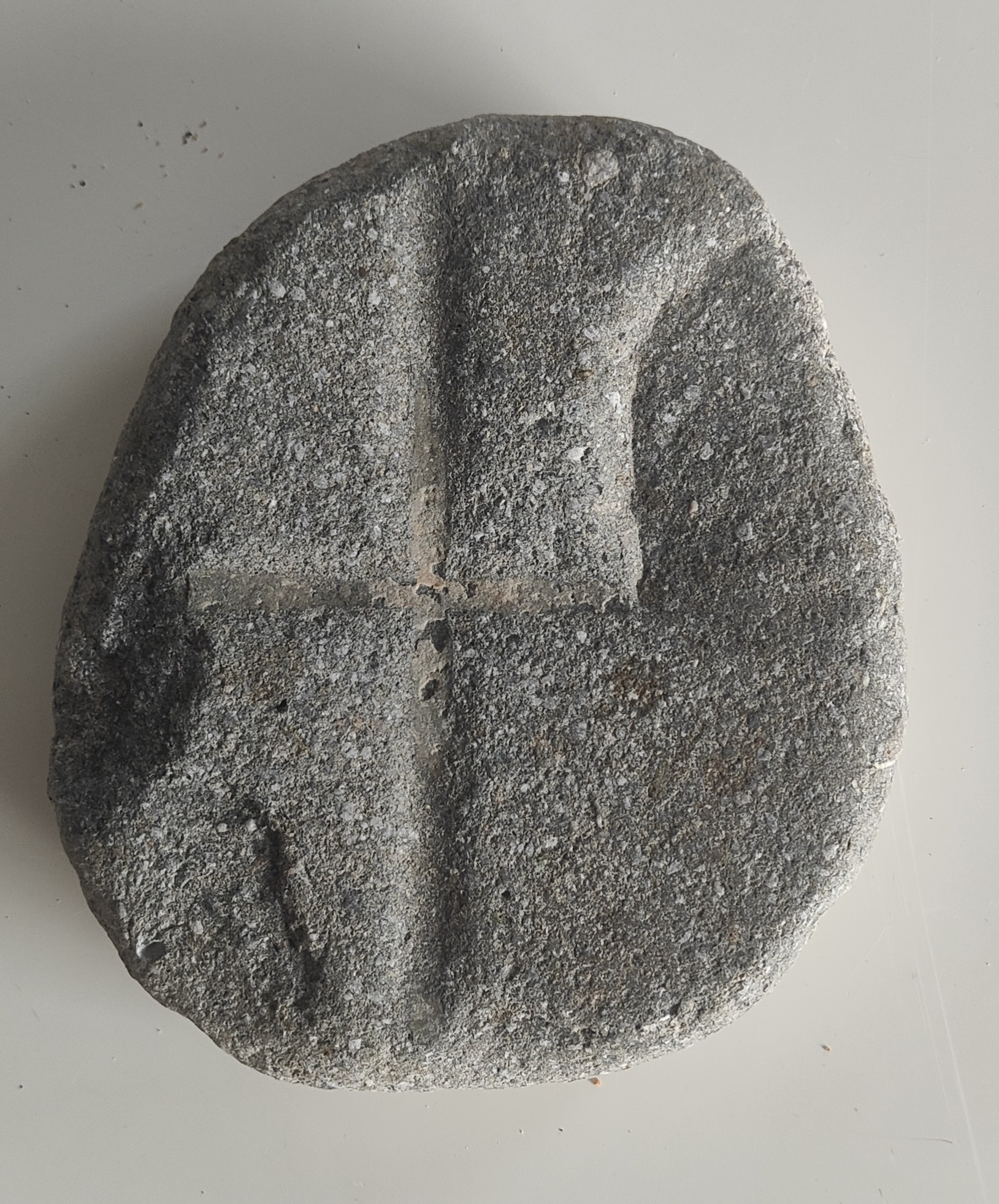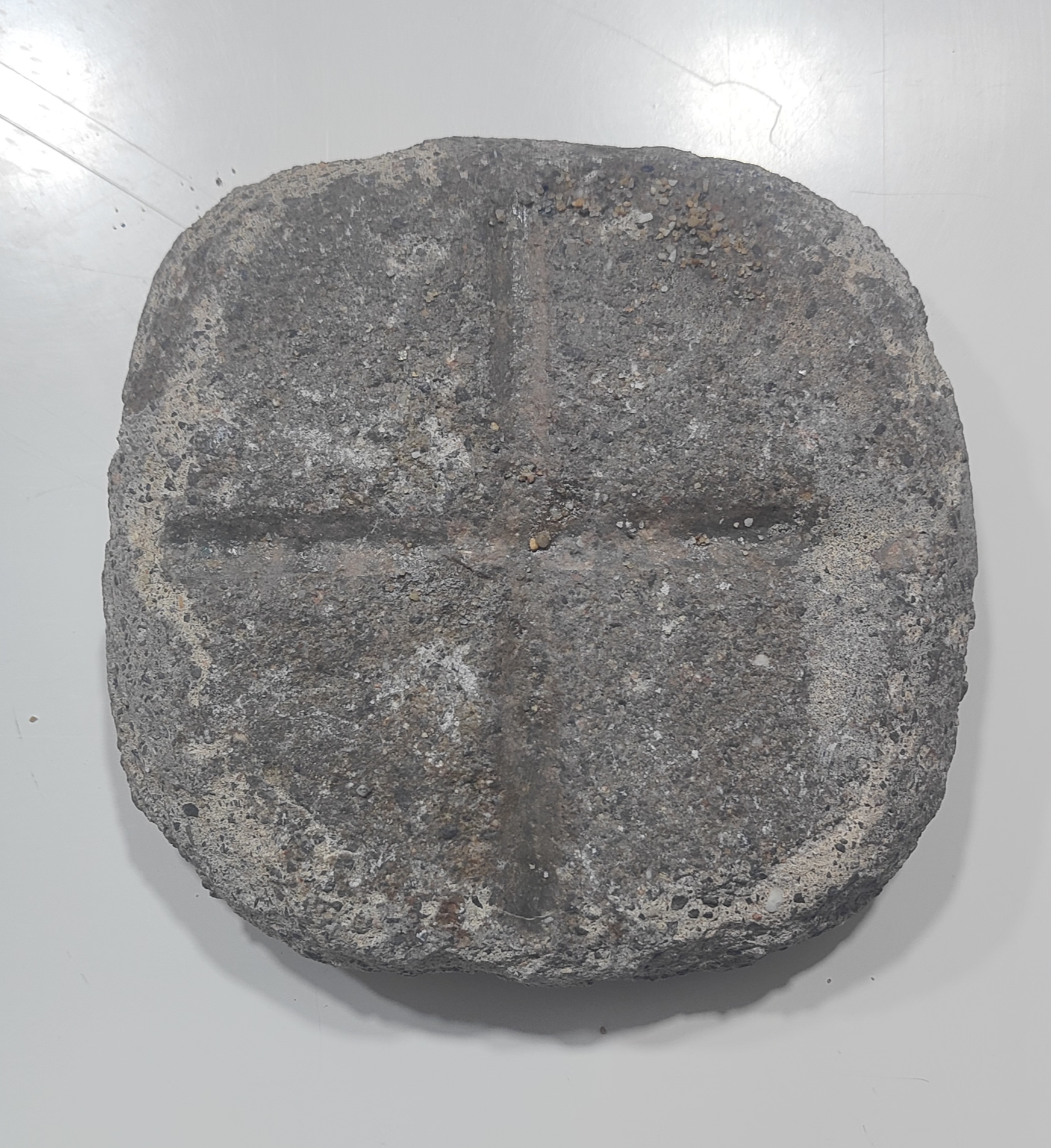 Original Panot from Barcelona, rescued from the city’s coast, maintaining the traditional Tauleta engraving with inner circles. Some wear is evident around the edges.