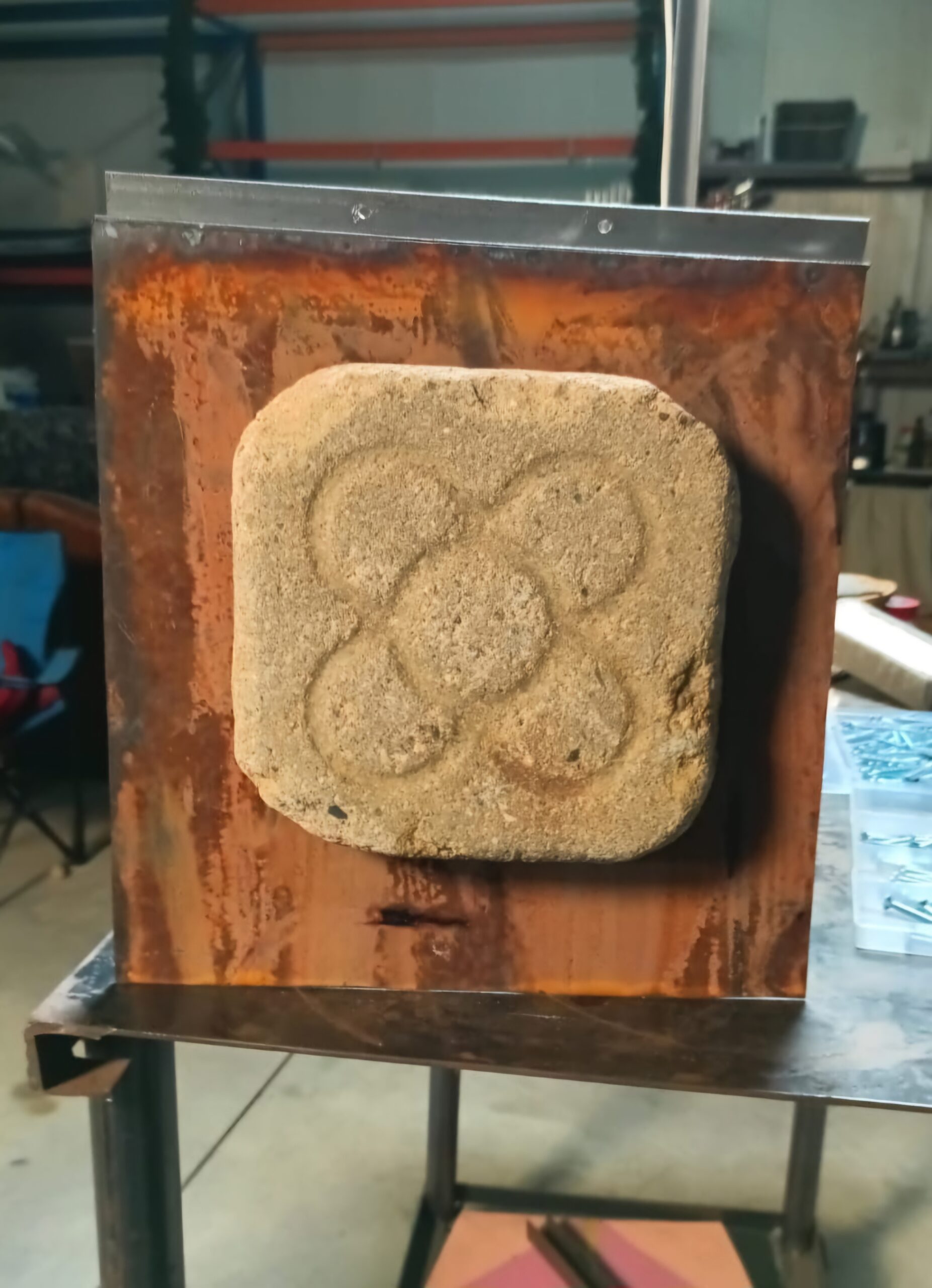 Panot originally from Barcelona, recovered from the Mediterranean coastline, featuring the well-recognized Tauleta design with inner circles. The corners show signs of general wear. The upper part shows greater wear, with the design partially faded.