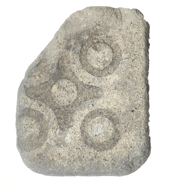 Authentic Barcelona Panot, retrieved from the waters of Barcelona, showcasing the iconic Calavera design. Loss of pattern on the upper left side and deep wear on the lower left side, leaving only part of the design remaining.