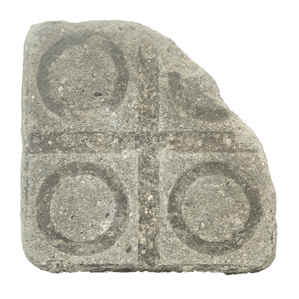 Authentic Barcelona Panot, reclaimed from the Mediterranean coastline, bearing the well-known Tauleta design with inner circles. Upper right part with missing design.