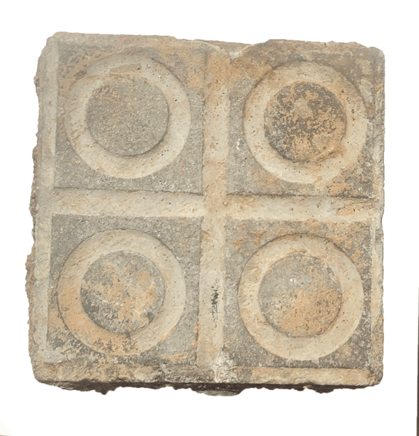 Panot from the historic city of Barcelona, rescued from the coastal seabed, featuring the iconic Tauleta design with inner circles. The corners present some degree of wear.