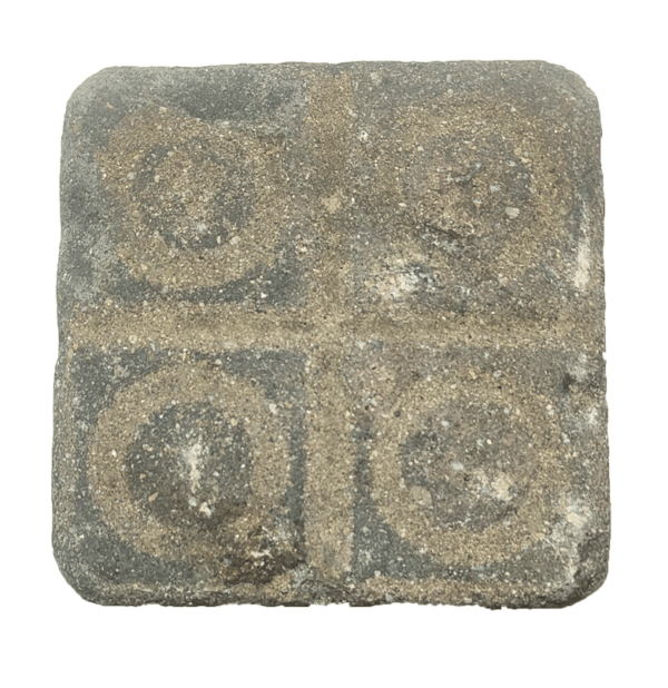 Historic Panot from the city of Barcelona, reclaimed from the coastline, preserving the renowned Tauleta design with embedded circles. Corners well preserved.